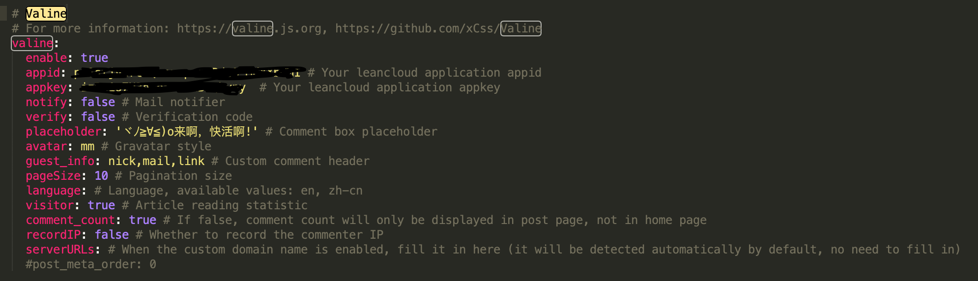 然后就是去博客的主题配置文件中去定义valine的参数,比较新的next主题其实已经写好了,就需要自己调下,如下图: